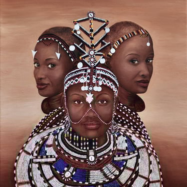 This painting of three Samburu women is rooted in my earliest memories of Kenya — a place where colour, culture, and grace shaped my childhood imagination. I remember watching the Samburu women with quiet awe, captivated by the elegance of their posture, the music of their laughter, and the dazzling beadwork they wore with such pride. Their adornments were not just decoration, but expressions of identity, beauty, and tradition, each bead carrying meaning.