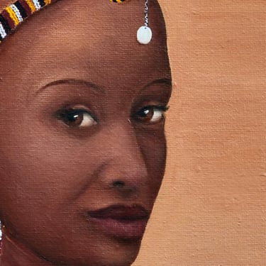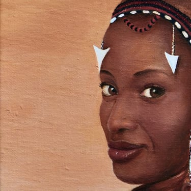 In this oils-on-canvas piece, I wanted to honour that memory with care and fidelity. Every bead has been meticulously painted, stroke by stroke, in tribute to the artistry I admired as a child. The women stand together in calm confidence, their presence both strong and serene, embodying the spirit of a culture that influenced me long before I had words for it.