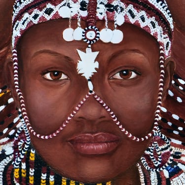 This painting is not only a portrait, but a remembrance — a way of returning to Kenya through colour, texture, and the timeless dignity of the Samburu women who first opened my eyes to the beauty of adornment and the depth of tradition.