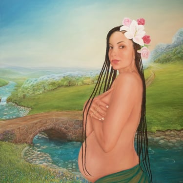 Eleonore herself stands as the luminous centre of the scene, her pregnancy symbolising hope, continuity, and the profound beauty of expectation. Crowned with roses and a single lily, she carries both the symbolism of love and purity, blending tenderness with quiet strength. The contrast between her calm, grounded presence and the expansive landscape behind her creates a sense of harmony — a reminder that every life unfolds within a larger, ever-evolving world.