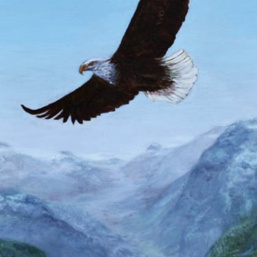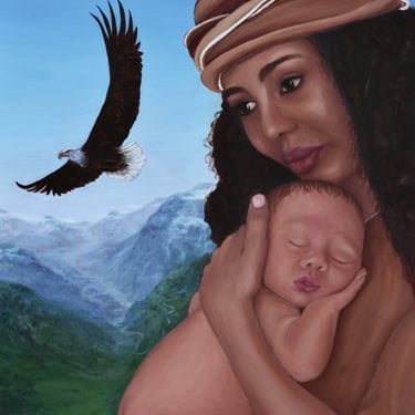 Behind her stretches a luminous valley blooming with flowers, a landscape that suggests renewal, beauty, and the unfolding of life. Above them, an eagle circles in the open sky, its powerful wings a symbol of guardianship, freedom, and watchful grace. Painted on copper, the surface lends a warm, glowing undertone to the work, allowing the light to breathe through the colours and giving the scene an almost sacred radiance.