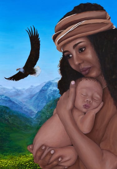Magdalena is a painting born not from a single memory, but from the quiet places of the imagination where symbols take form. Although Magdalena is not a real person, she represents the timeless essence of motherhood — a figure of tenderness and strength woven from countless stories, emotions, and human experiences. She cradles a baby gently in her arms, her posture protective yet peaceful, embodying the universal bond that connects mother and child across cultures and generations.