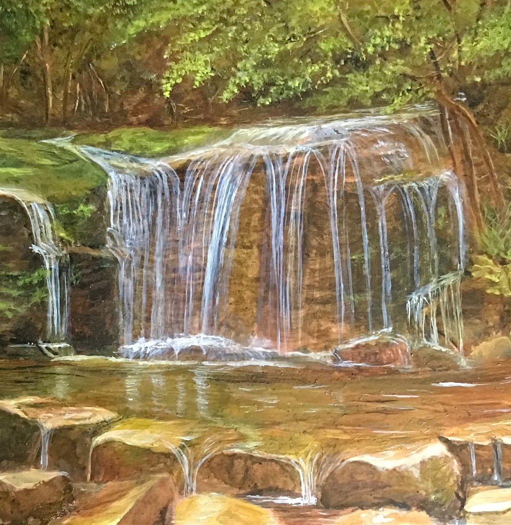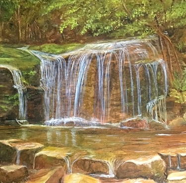 Secret Paradise is a painting born from stillness — a hidden haven in West Wales where the world softens and the spirit breathes more easily. Tucked away from the gaze of others, this secluded waterfall feels almost otherworldly, a place where light filters through leaves like whispered blessings and the sound of water becomes a quiet song for the soul. Here, time loosens its grip. The cares of the day slip away with the current, carried over smooth stones and into the pool below.